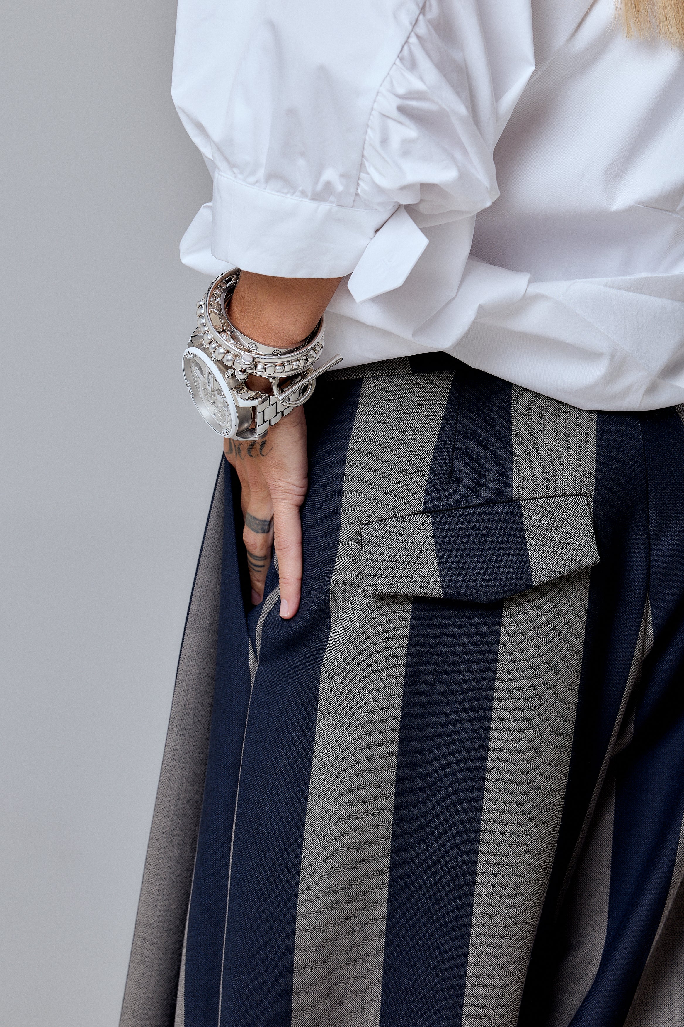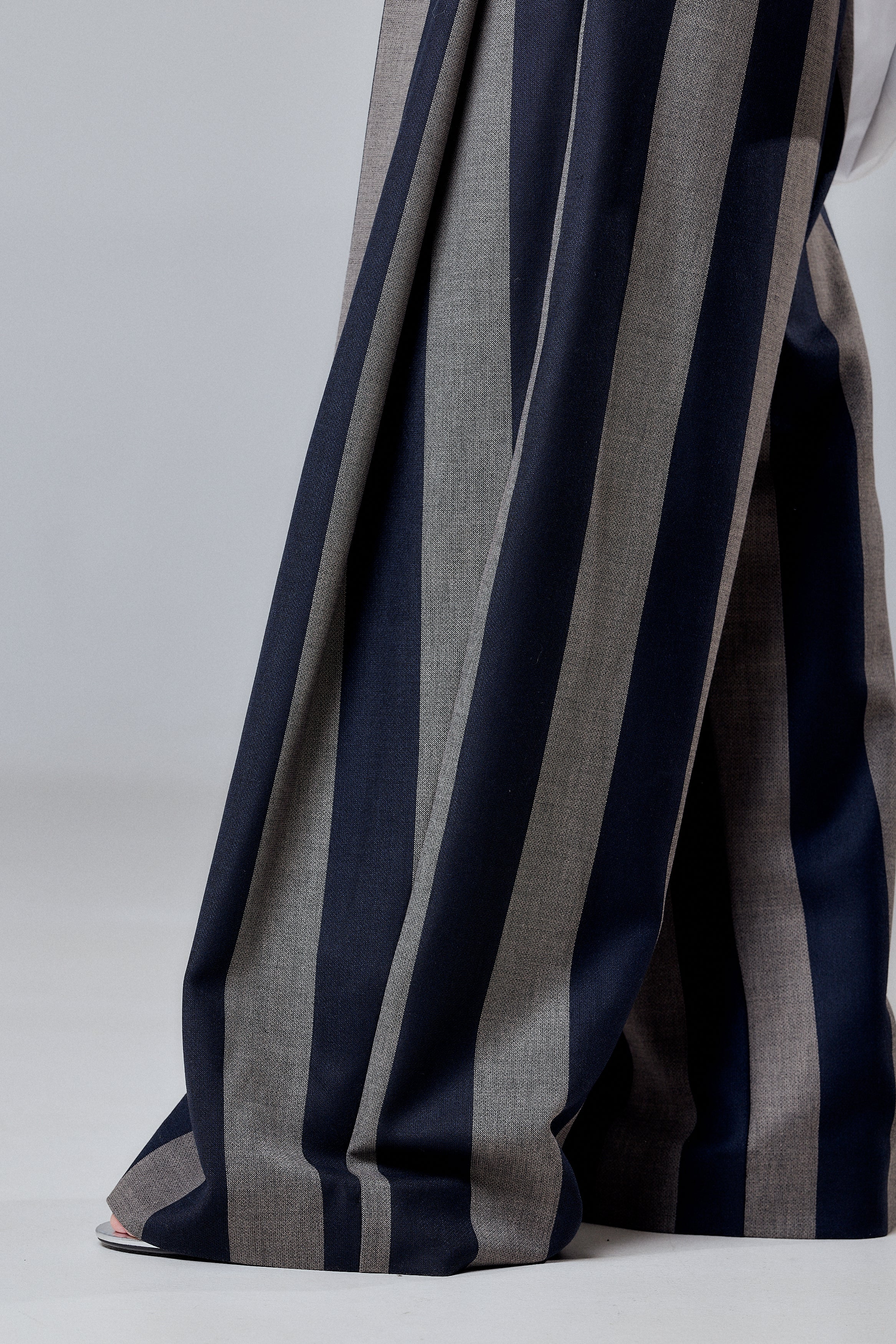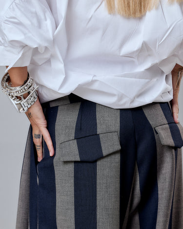 A bold reinterpretation of tailored minimalism — these wide-leg striped pants merge classic menswear influences with a strong contemporary edge. The vertical stripes in deep navy and muted taupe elongate the silhouette while adding architectural rhythm to the design. Cut from structured yet fluid fabric, the pants feature a high waist, front pleats, and statement back pockets with flaps for a refined utilitarian detail.