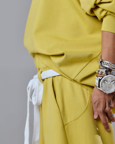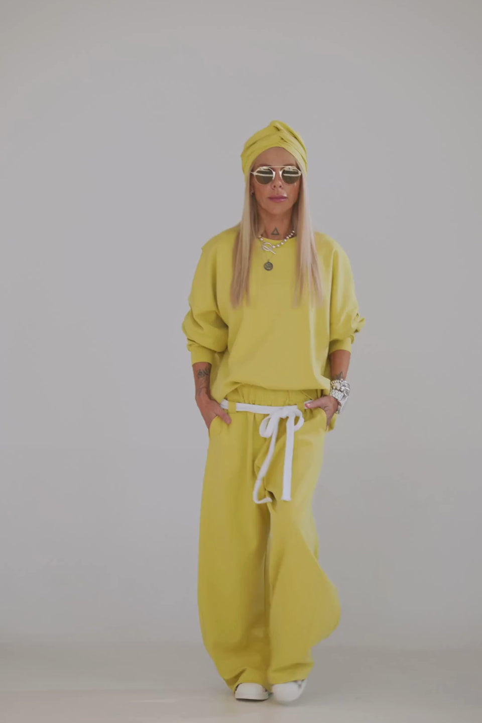 The Yellow Oversized Sweat Set redefines casual sophistication with a bold, modern twist. The set features a relaxed, architectural silhouette — a voluminous sweatshirt with a daring open-back detail and matching wide-leg pants with an elastic waist and contrast drawstring for a perfect fit.